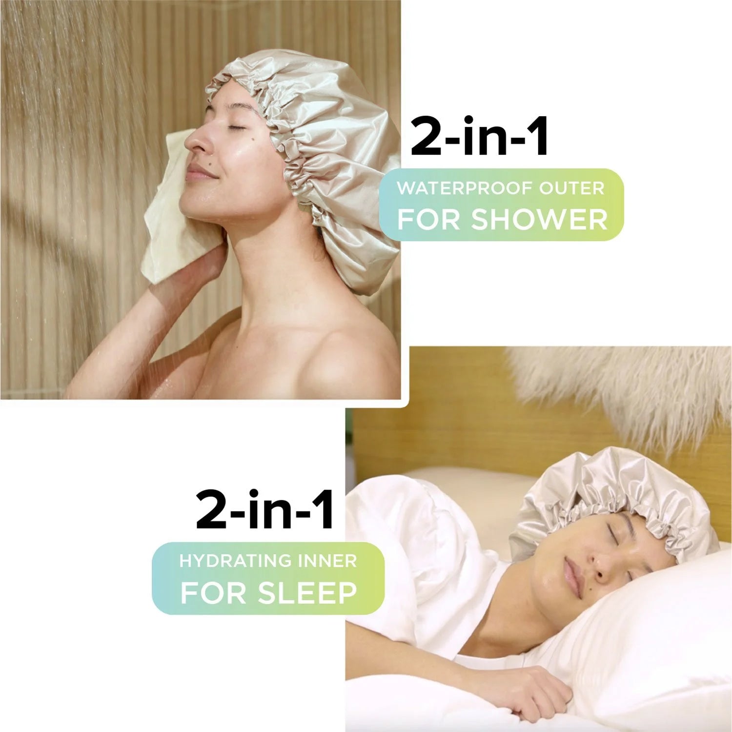 Transform your hair care routine with this versatile 2-in-1 shower & sleep cap. Its engineered using two high-quality materials: a waterproof outer layer and a luxurious satin inner lining.