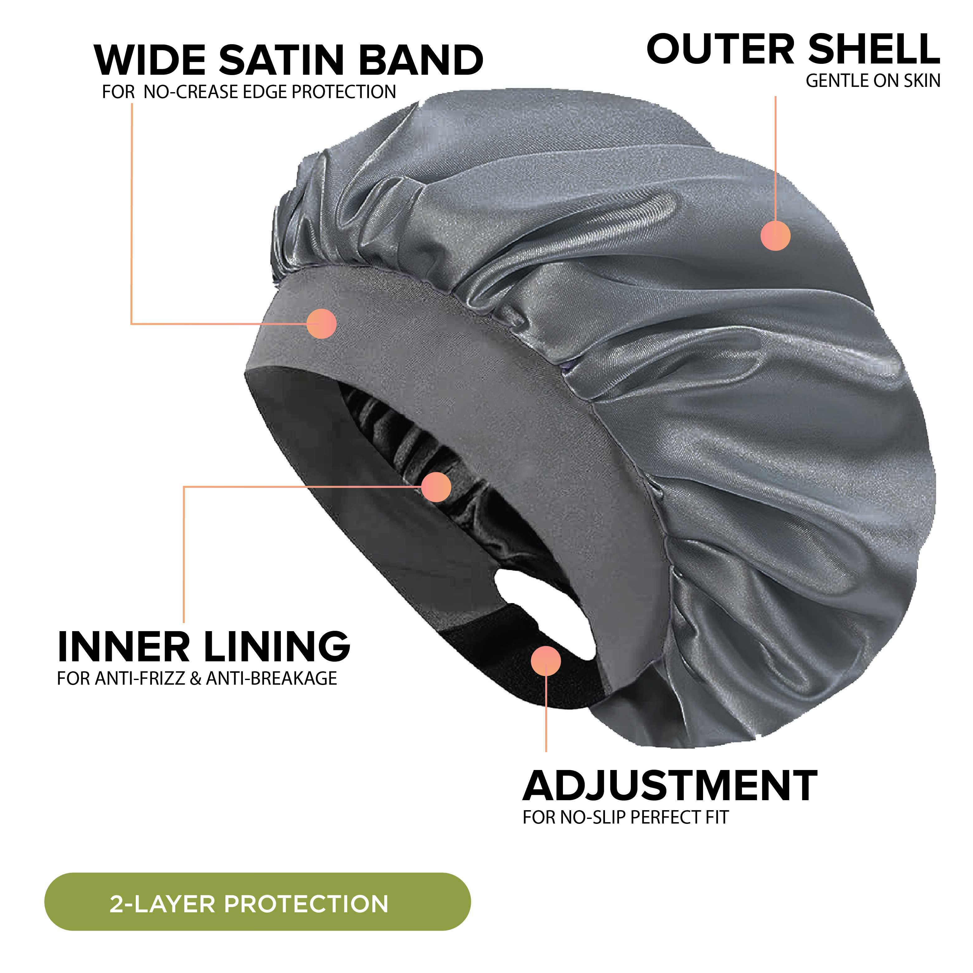 Edge Protection: say goodbye to abrasive & uncomfortable elastic with a wide satin band around front & sides that shields & protects both your skin & hair
